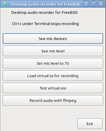 Then virtual_oss must be loaded and then Desktop recording with audio is possible. If you have the wrong device (/dev/dspX) loaded for virtual_oss, recording does not work, so you need set the right device and reboot the computer.